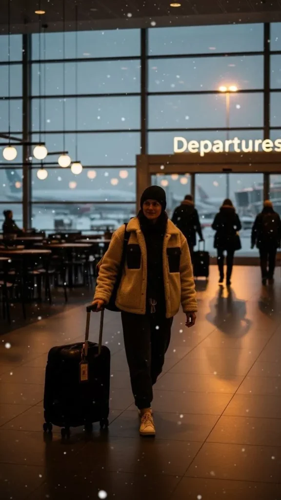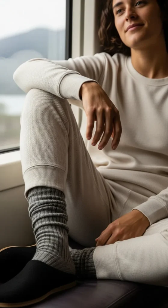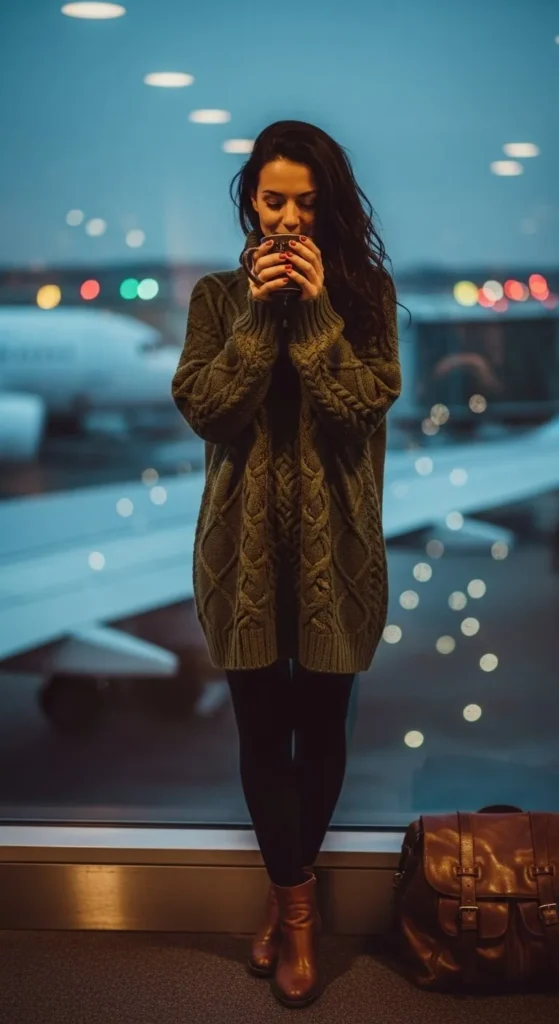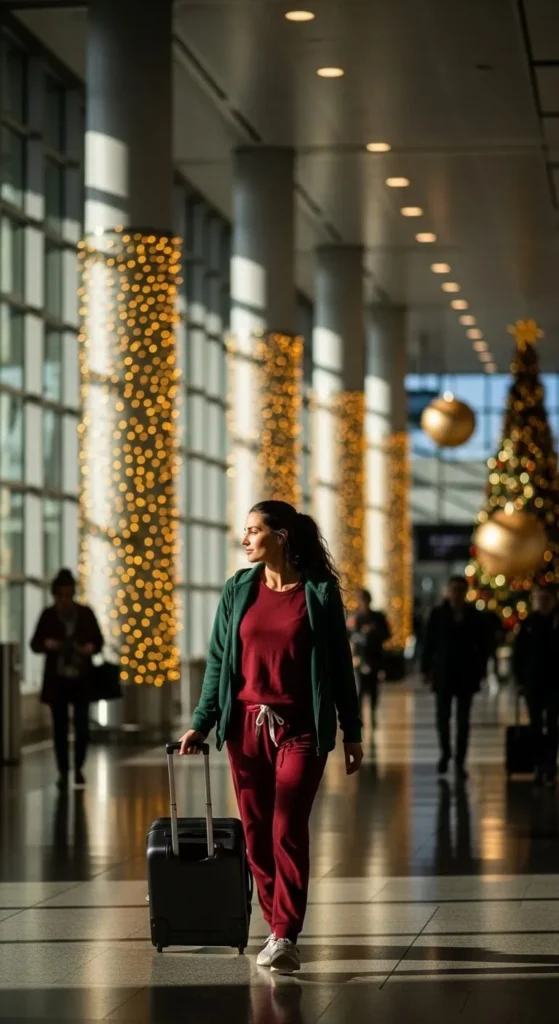 A thermal set keeps you warm on cold flights. Choose soft, breathable fabric so you don’t overheat. Add thick socks for extra warmth once you’re seated. Pick subtle festive colours like dark red or green. If you’re saving money, grab basic thermal pieces from a grocery or outlet store and style them with accessories you already have. Slip-on shoes help at security. Bring a scarf that doubles as a blanket. This outfit works well for travellers flying at night or visiting colder destinations.
