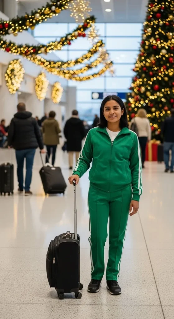 A tracksuit in Christmas colours brings a fun, seasonal touch to your outfit without feeling costume-like. Choose soft fabrics and relaxed fits. A deep green tracksuit feels classic, while a soft red one adds a warm holiday tone. White trainers pair nicely with both. If you’re on a budget, look for a plain tracksuit and style it with a cute scarf instead of buying a printed holiday set. Keep accessories minimal to avoid bulk. This outfit works great for long-haul flights because it feels soft and warm while still looking tidy.