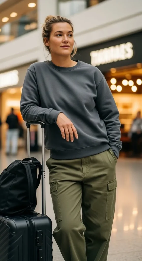 A crewneck sweatshirt paired with cargo pants gives you comfort and pockets for easy access. Choose a soft crewneck in holiday colours or neutrals. Cargo pants should have a relaxed fit so you stay comfy in your seat. If you’re watching your budget, pair an old sweatshirt with affordable cargo pants from a local store. Wear trainers and bring a small pouch inside your bag to store tiny items. This outfit works well for travellers who like utility and softness mixed together.