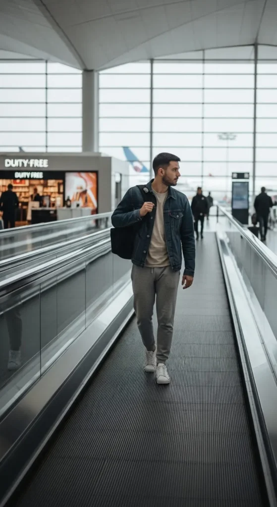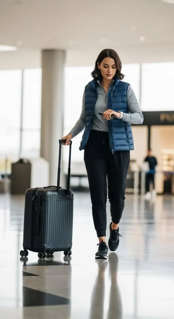 A puffer vest adds warmth without making you sweat on long walks through big airports. Pair it with soft joggers and a fitted long-sleeve top for balance. Stick to dark or neutral shades so the outfit feels clean and travel-friendly. Joggers keep your legs comfy while sitting for long hours. If you want to save money, use joggers you already own and add a simple vest from an outlet store. Wear lightweight trainers to keep your steps easy. Bring a scarf if you’re flying to a colder destination. This outfit feels relaxed, warm, and simple to adjust when temperatures shift during travel.