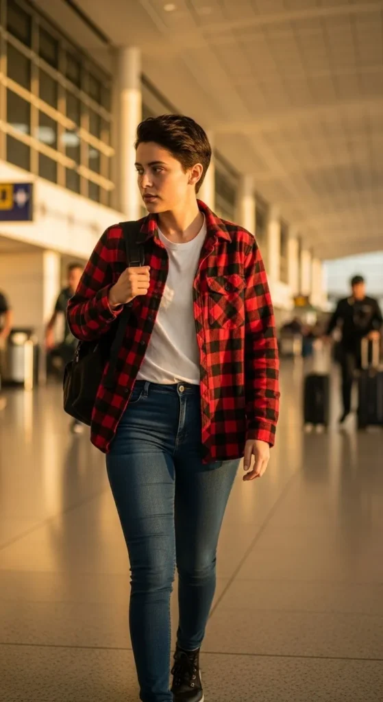 A flannel shirt adds instant holiday style without extra effort. Layer it over a simple tee for comfort on the plane. Pick stretchy jeans so you can sit easily during long flights. Classic red flannel gives a Christmas feel, while green or neutral patterns look timeless. If you’re trying to stay on budget, buy a flannel from a thrift shop and pair it with jeans you already own. Wear comfy trainers and carry a backpack with pockets to keep essentials organised. This outfit works well for travellers who like a relaxed, warm, and layered look.