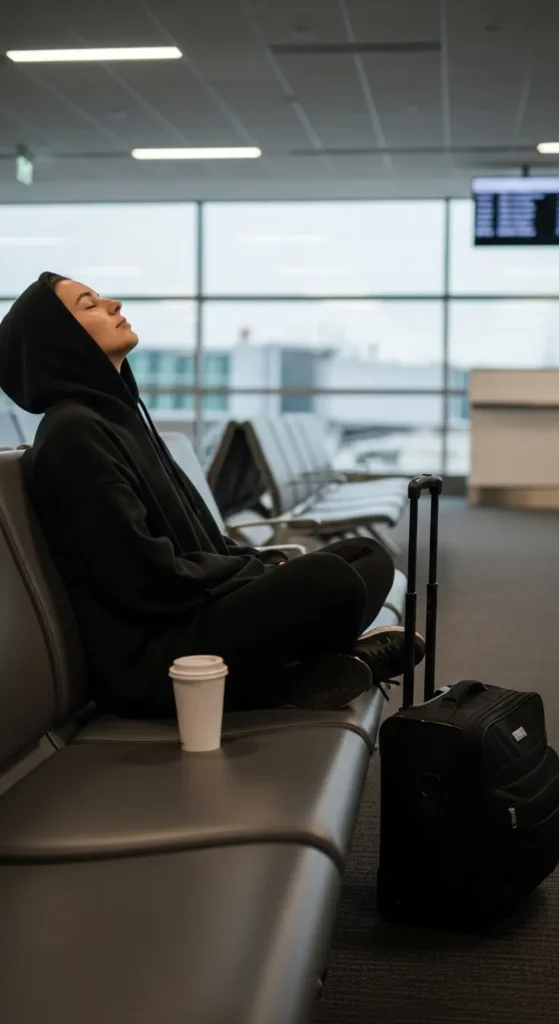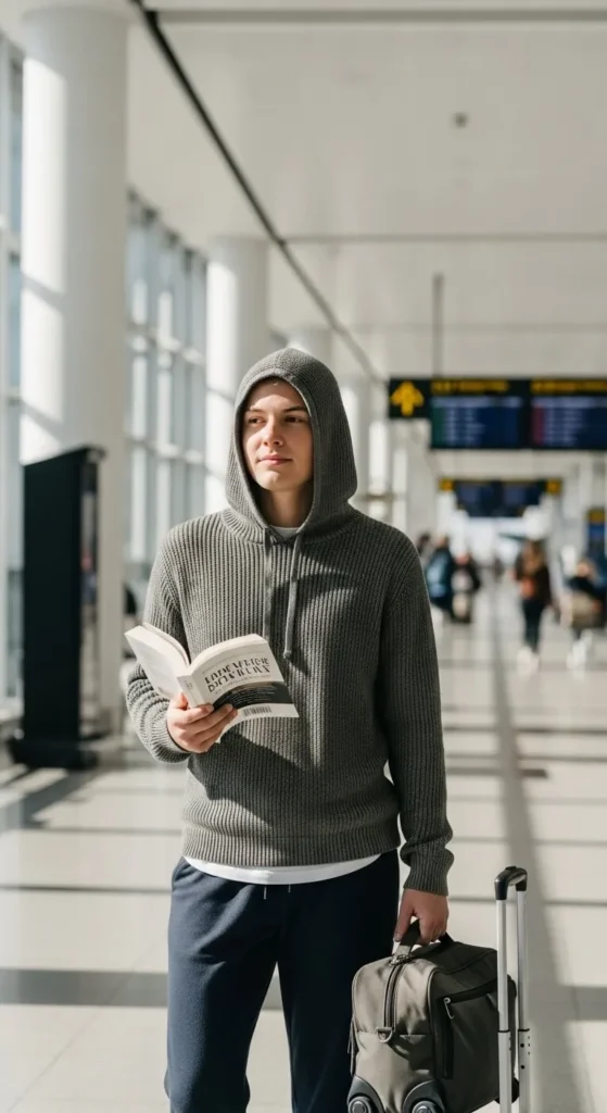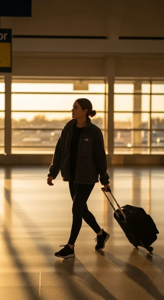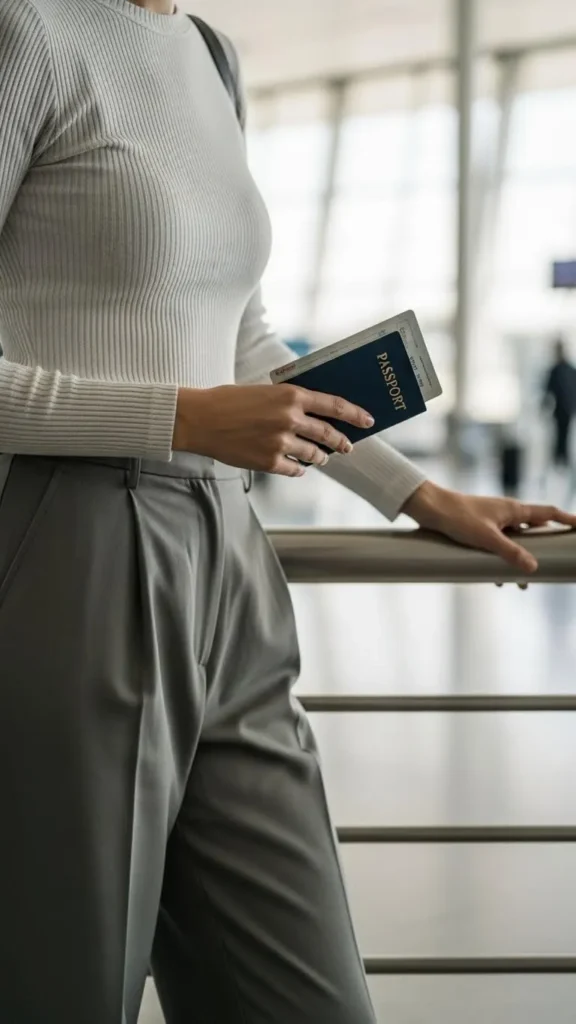 A hoodie and gilet combo is perfect for layering. The hoodie keeps you warm, while the gilet adds a lightweight outer layer. Choose soft colours like cream, pine, or muted grey. If you’re on a budget, reuse your usual hoodie and add an inexpensive gilet. Wear comfortable trainers and bring a backpack to stay hands-free. This outfit works well for travellers who prefer layers that adjust easily during busy travel days.