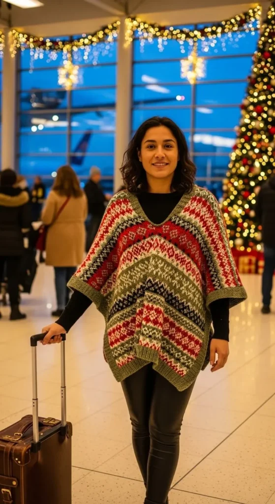A knitted poncho feels warm and free-flowing, perfect for travel days that require flexibility. Pair it with black leggings and comfortable sneakers. Choose soft festive tones like cream, wine red, or deep green. If you’re saving money, thrift a poncho and pair it with leggings you already own. Bring a crossbody bag that sits neatly under the poncho for security. This outfit works great for travellers who like layers they can adjust quickly.