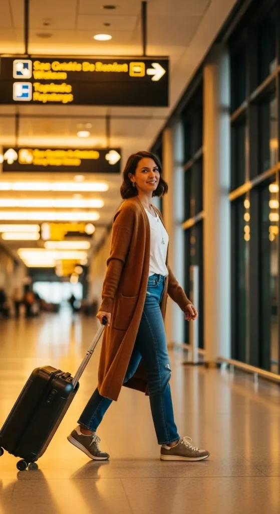 A long cardigan feels like wearing a blanket without actually bringing one. Layer it over a simple white tee and straight-leg jeans for a relaxed look that still feels neat. Pick soft colours like cream, grey, or maroon for a holiday vibe. If you want to save money, reuse your favourite jeans and only add a thrifted cardigan. Pair with slip-on shoes or comfortable boots that work well in colder cities. Add a belt bag to keep essentials secure and accessible. This outfit works great for travellers who prefer layers they can remove easily without slowing down in busy terminals.