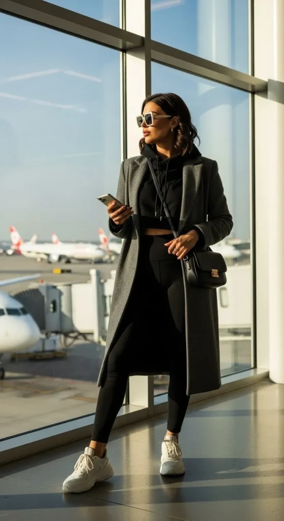 An oversized hoodie and leggings feel perfect for airport days. The hoodie keeps you warm during check-in and on chilly planes. Choose a soft fabric that feels gentle on your skin when sitting for hours. Black leggings make the look simple, flattering, and easy to style with any colour hoodie—especially Christmas shades like burgundy or forest green. If you prefer a budget option, use leggings you already own and add a plain hoodie from a local store. Slip-on shoes help you breeze through security. Add a scrunchie or headband for a cleaner look even after long hours. Bring a small tote for snacks, charger cables, and your passport. This outfit works well if you want something stretchy, soft, and casual that still looks put-together.