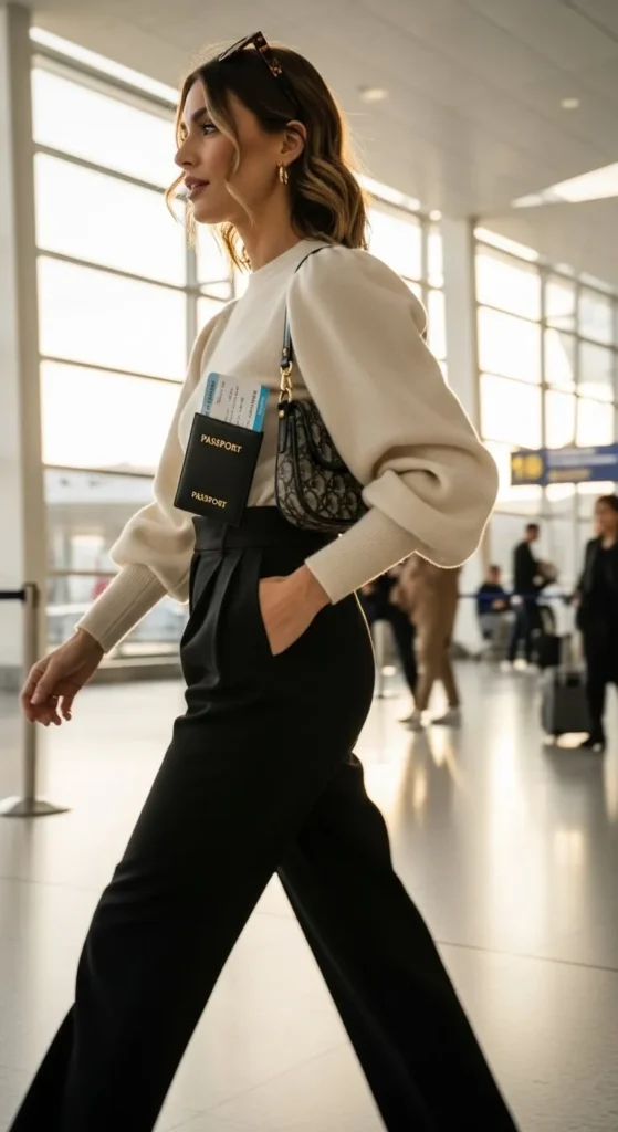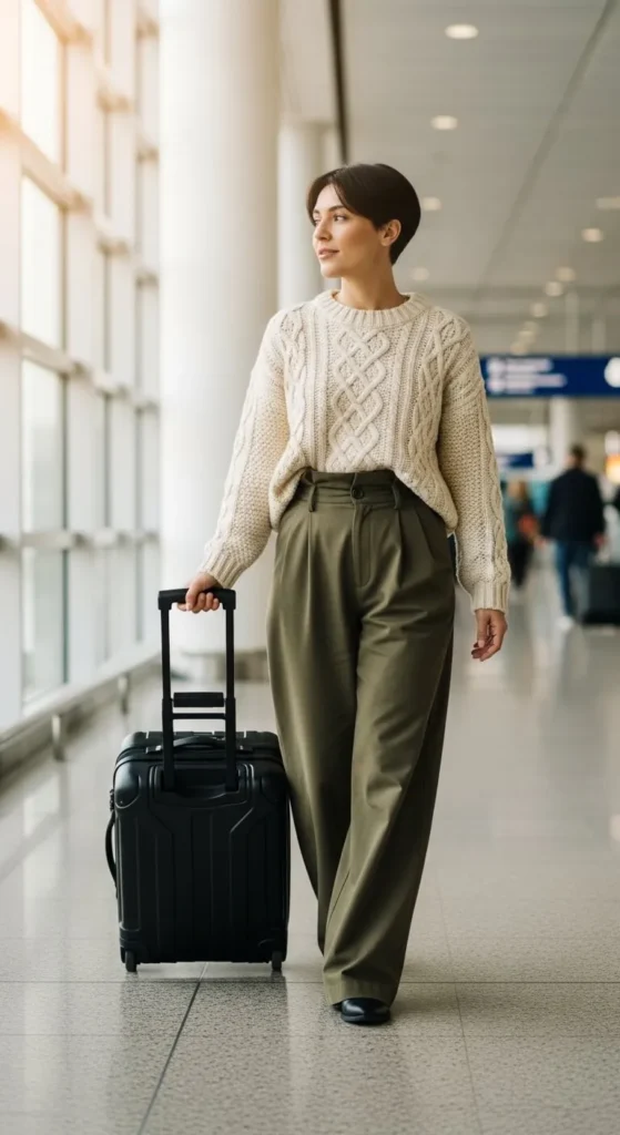 A sweater and wide-leg pants combo looks relaxed and roomy, which is perfect for long flights. Pick a sweater that feels soft on your skin so it stays comfy when leaning back in your seat. Wide-leg pants help you move easily, especially when carrying bags. Choose soft neutrals or mild festive shades. If you want a budget approach, pair a sweater you already love with basic wide-leg pants from a local store. Add a tote bag for easy access to snacks or books. Simple flats or trainers finish the look without adding weight.