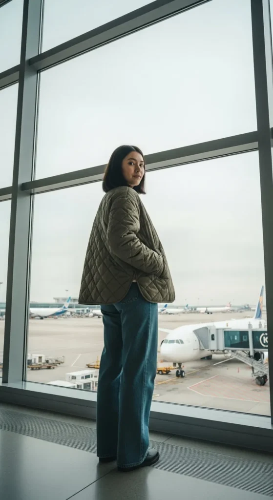 A quilted jacket offers warmth and a cozy winter feel for Christmas travel. Pair it with soft jeans for comfort during long waits. Pick muted holiday shades or neutrals. If you’re on a budget, reuse older jeans and focus on finding a quilted jacket at an outlet store. Wear slip-on trainers and bring a tote with pockets. This outfit works well if you like warmth without heaviness.