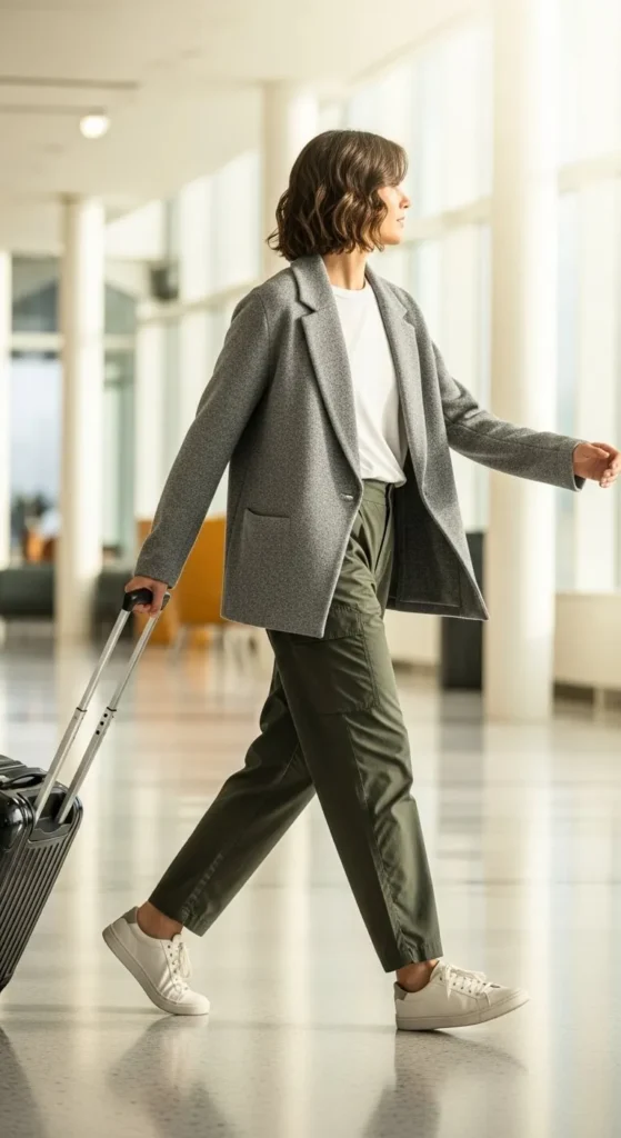 A soft blazer gives your look shape without losing comfort. Choose fabrics like knit or jersey instead of stiff materials. Pair it with comfy pants such as straight-leg trousers or soft joggers. Stick to simple colours for a calm travel look. If you’re on a budget, pair an older blazer with basic pants from your wardrobe. Wear trainers or loafers to stay comfortable. Bring a compact pouch for chargers and headphones. This outfit works well if you like polished looks that still feel relaxed.
