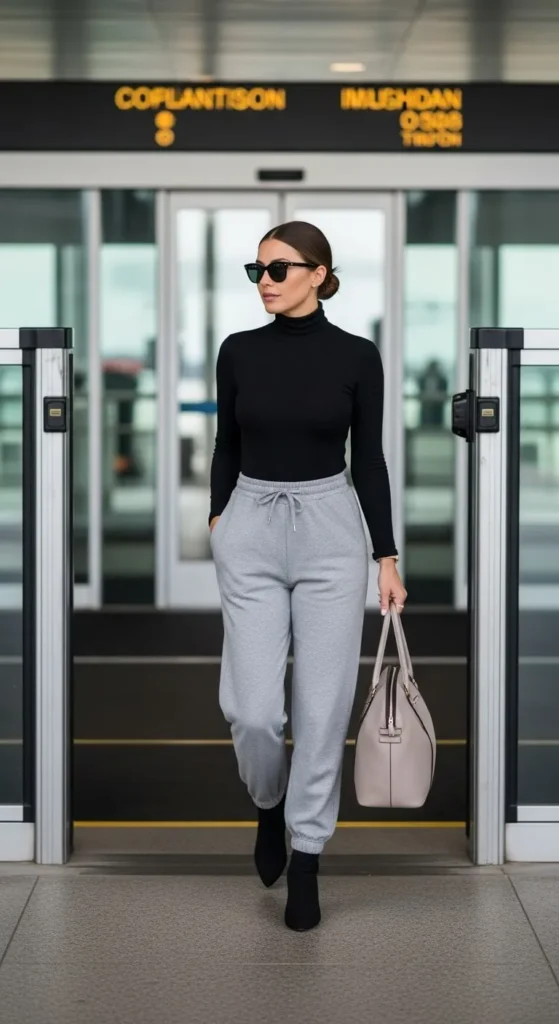 A turtleneck keeps your neck warm while giving your outfit a clean shape. Pair it with soft joggers for comfort and movement. Choose earthy or holiday colours like black, cream, or muted red. Tuck the front slightly to give shape without feeling tight. If you want to save money, reuse an old turtleneck and thrift soft joggers. Wear neutral sneakers and keep jewellery minimal. This outfit feels warm, simple, and ideal for early morning flights.
