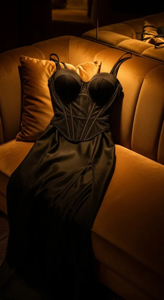 A black corset gown with a slit gives structure and movement in one look. The corset adds shape, while the slit helps with comfort when walking. Choose satin, crepe, or jersey depending on your preference. Add thin heels and a shiny clutch. For a low-cost upgrade, replace the original straps with crystal straps from an accessories shop. DIY idea: glue rhinestones along the bodice lines to add texture. This outfit suits more glamorous charity gala nights.
