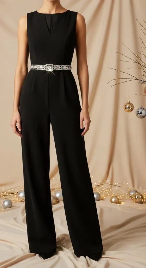 A gold sequin jumpsuit feels fun, bold, and perfect for Christmas celebrations. Jumpsuits are comfortable, making them ideal for long events. Gold sequins reflect the lights beautifully on the dance floor or in photos. If you don’t want a full-sequin piece, choose one with sequin accents only on the top. Pair it with nude heels and a sleek clutch. A simple ponytail or straight hair keeps the focus on the jumpsuit. DIY idea: add a waist belt to help shape the jumpsuit if it feels too loose. This outfit suits events where the atmosphere is glamorous but relaxed.