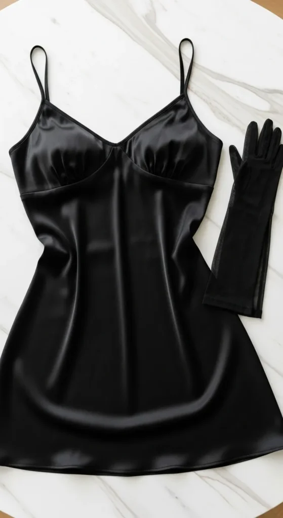 A black satin slip dress with sheer gloves mixes classic and modern styles. The dress itself is simple, so the gloves add instant drama. Choose gloves that fit snugly—mesh or tulle works. To make the outfit more gala-ready, add a small diamanté choker or statement earrings. For budget shopping, look for gloves in costume or bridal sections—they’re much cheaper. You can also add a DIY low back using a tailor or fabric scissors if you want more shape. This outfit works when you want something sleek but still festive.