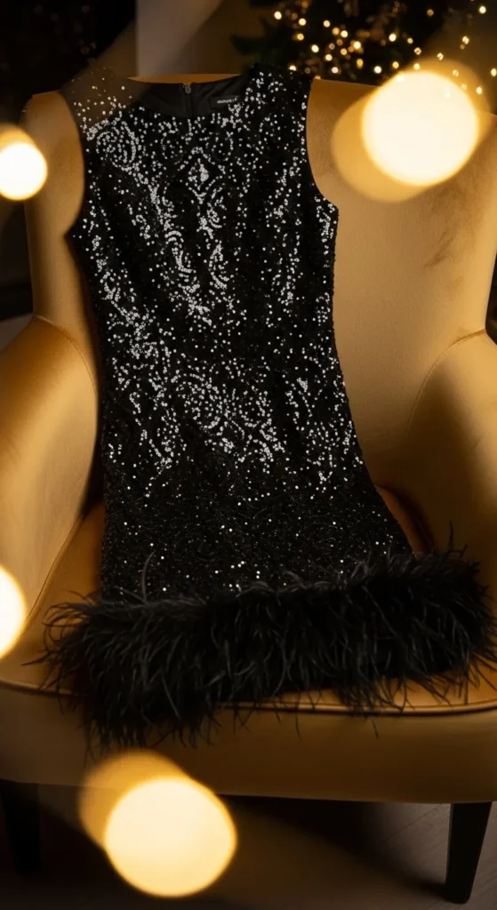 A black sequin midi dress with feather trim gives you two textures—sparkle and softness. The feather hem brings movement to the outfit, making it great for photos. Look for dresses where the feathers are detachable; they’re easier to clean and usually cheaper. Pair with silver heels or patent pumps. DIY idea: buy a feather band and attach it to the hem with hidden clips. Keep accessories simple since the dress already has plenty of detail. This outfit suits cocktail-style galas and semi-formal fundraisers.