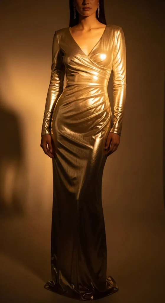 A gold column dress gives you a strong gala moment with almost zero styling required. Choose a fabric with a metallic sheen—lamé, foil, or sequined gold. Keep the neckline simple so the fabric becomes the main feature. If you want comfort, pick a stretch fabric that lets you move easily. Add nude or black heels and keep your bag small. For budget shopping, look for gold dresses in sale sections after New Year’s—they’re often heavily discounted. To personalise the look, stitch on tiny gold beads or sequins along the straps for extra detail. Wearing your hair slicked back also adds a sharp finish without extra cost.