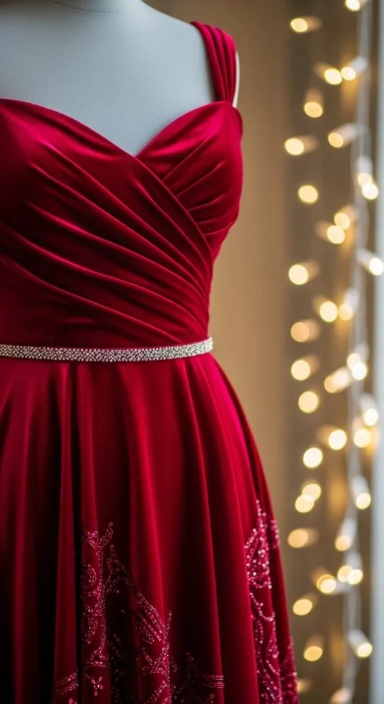 A red velvet gown is a Christmas gala favourite because it looks expensive even when it isn’t. Pick a silhouette that moves well when you walk—A-line, fitted, or mermaid all work. Velvet photographs beautifully under warm lights, giving you a rich finish without much effort. If you want a more affordable version, look for stretch-velvet pieces online or in mid-range shops. Add gold earrings, a nude clutch, and a soft-glam makeup look. For a DIY twist, sew or pin velvet bows on the straps to add shape and detail. A wrap or faux-fur shawl keeps you warm without taking away from the outfit. This look is reliable for charity galas that lean formal but still feel festive.