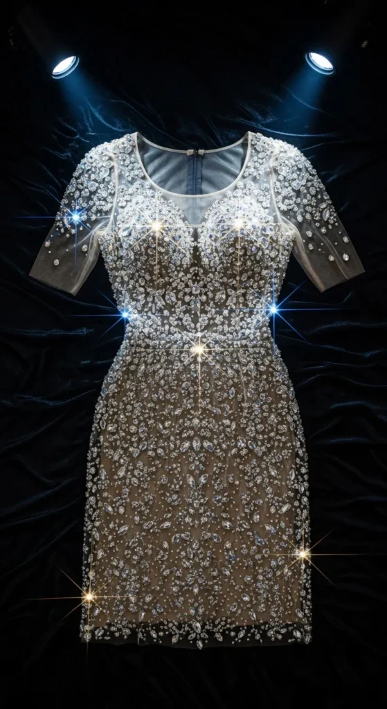 A mesh dress with crystal accents brings a clean, modern look. The crystals catch the light and make it feel dressy without relying on sequins. Choose a nude or black base depending on your style. Pair with strappy heels and a compact clutch. Affordable versions come with scattered embellishments instead of full coverage. DIY idea: glue small crystals to the sleeves or neckline for extra shine. This outfit suits galas with trendy or fashion-forward guests.