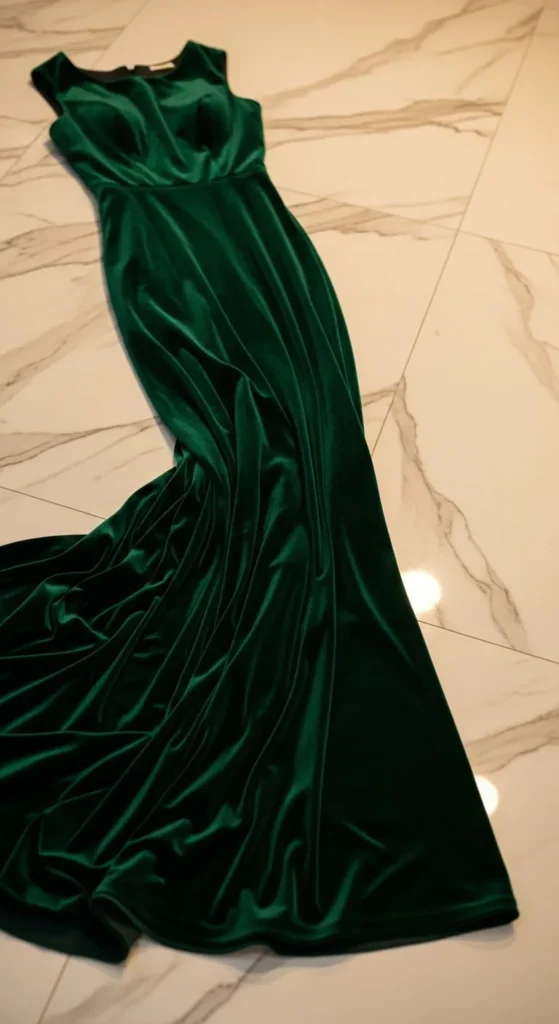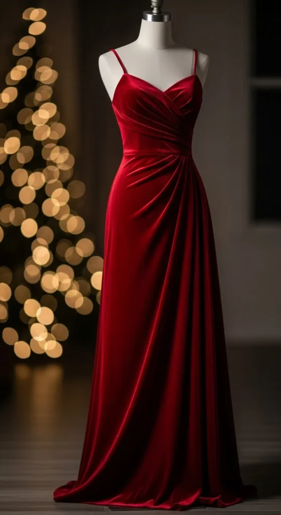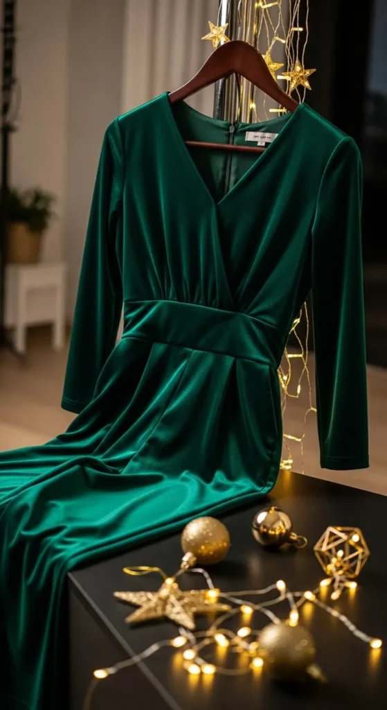 A green velvet gown with a soft train gives a regal look that fits perfectly with Christmas themes. Velvet makes the colour appear richer, and the slight train adds drama without restricting movement. Choose a gown with a structured bodice for shape. Budget-friendly versions are often found in winter or eveningwear sales. If the train is too long, a tailor can shorten it easily. DIY idea: add a line of small crystals along the neckline for a polished finish. Pair with metallic heels and minimal jewellery.
