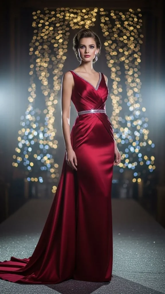 A burgundy one-shoulder gown gives a sculpted, confident look without feeling overdone. The asymmetry draws attention upward, which helps if you prefer a more modest silhouette overall. Choose crepe, jersey, or satin fabric for clean lines. Burgundy works beautifully for Christmas themes and pairs well with gold or rose-gold accents. For an affordable version, choose polyester blends—they hold shape well. Add a matching wrap or a faux-fur stole if the venue is cold. DIY idea: glue or stitch small rhinestones along the shoulder strap to create a statement detail. This look suits gala nights where you want something bold but relaxed.