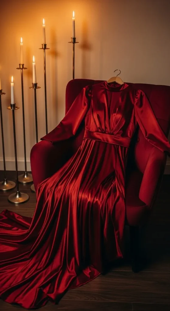 A ruby satin gown always stands out at Christmas galas. The colour feels festive without trying too hard, and satin drapes in a way that looks smooth in photos. If you want something affordable, look for dresses with a side slit already stitched in. Pair it with gold heels or strappy nude sandals. Add a matching ruby clutch or a metallic bag for contrast. For a small DIY upgrade, place a rhinestone brooch at the top of the slit to give the dress more personality. Light curls and soft glam makeup complete the look. This outfit works well for galas where you’ll be photographed often.