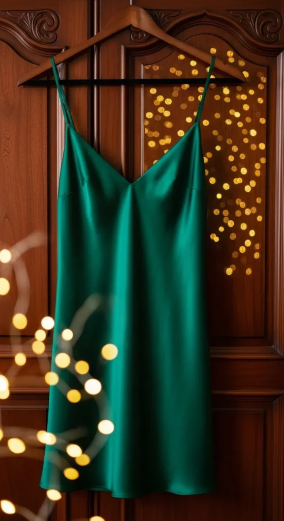 An emerald satin slip dress feels calm, classy, and very Christmas-friendly. Satin reflects light softly, so it instantly looks dressy. You can layer it with a long coat, shawl, or faux-fur wrap depending on how cold it is. If you want more shape, add a thin belt at the waist. For an affordable option, choose polyester satin—it still photographs well. Add simple jewellery like thin hoops or a dainty necklace. If the dress feels too minimal, pair it with a glittery clutch for a holiday touch. You can even add a DIY leg slit using a small invisible stitch if your dress is too straight. This outfit works for both seated dinners and social mingling.