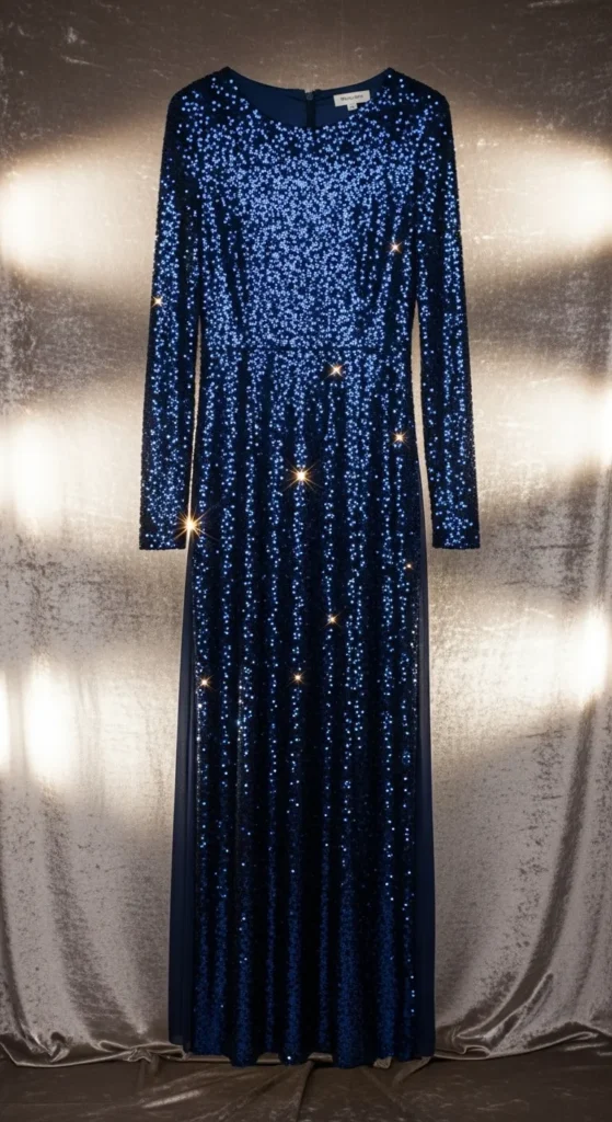 A navy sequin dress is always a safe but stylish pick. The long sleeves make it comfortable for winter events, and the colour feels dressy without being too loud. If you prefer a fitted look, choose stretch sequins. If you want movement, go for a looser shift style. Pair it with black heels and a simple clutch. For budget options, shop for sequined dresses in general eveningwear sections—they’re often cheaper than seasonal “holiday” selections. DIY idea: add a mesh panel or slit if the dress feels heavy. Wear soft, neutral makeup so the sequins can shine without competing.