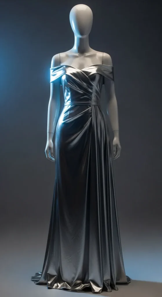 A silver off-shoulder gown creates clean lines and feels elegant without much effort. The neckline highlights the collarbones, giving a balanced frame for jewellery. Choose soft metallic fabrics like satin or stretch lamé. For an affordable option, look for metallic jersey dresses—they have stretch and cost less. Pair with diamond-style studs and a small silver clutch. DIY idea: add a row of beads along the neckline for more detail. This outfit works well for evening galas with a sparkling theme.