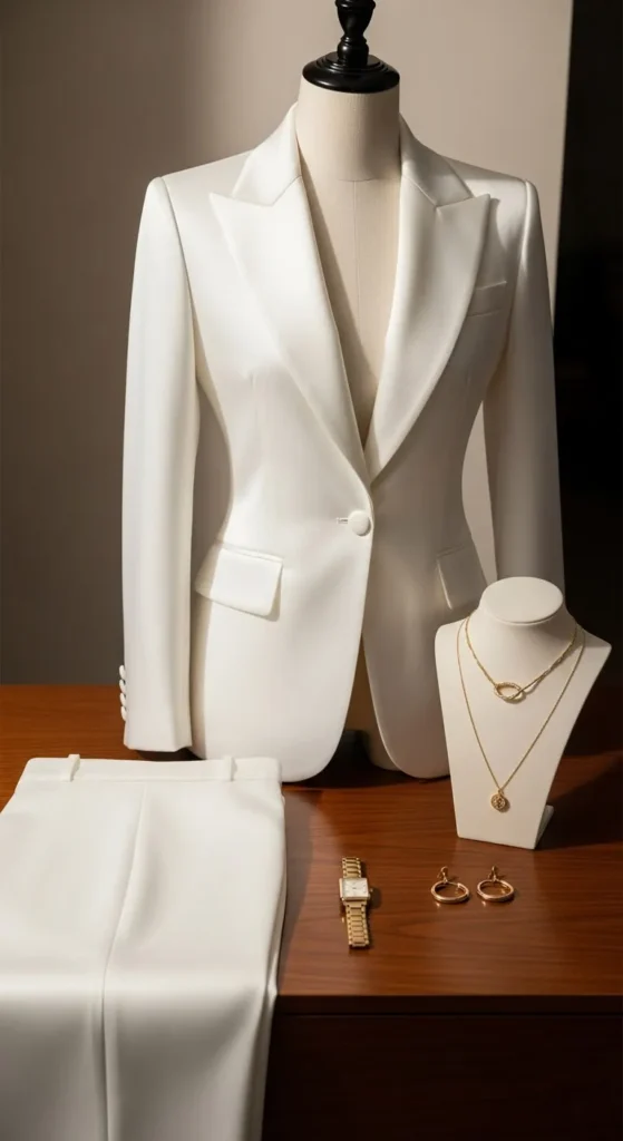A white satin suit gives you a classy, bold alternative to gowns. The fabric adds shine, while the suit shape feels sharp. Choose a fitted blazer or a longer tux-style jacket for variety. Pair with silver heels or pointed pumps. Affordable versions often come in polyester satin, which still looks expensive in photos. DIY idea: add a sparkly brooch to the lapel for a festive touch. A sleek ponytail or straight hair completes the clean look.