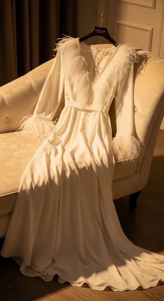 A winter white feather-trim dress gives you that old-Hollywood charm perfect for a Christmas gala. White feels fresh, and the feather detail adds drama while staying elegant. Choose a midi or full-length version depending on the dress code. Pair it with silver or clear heels. To stay within budget, look for dresses with removable feather trim—you can attach the trim using small clips or safety pins. DIY idea: buy feather bands from a craft shop and attach them to sleeve ends. Keep makeup soft—pink or nude tones work best. This outfit stands out without going overboard.