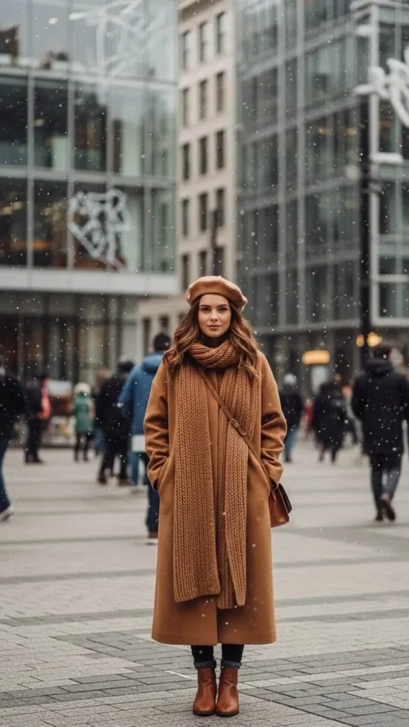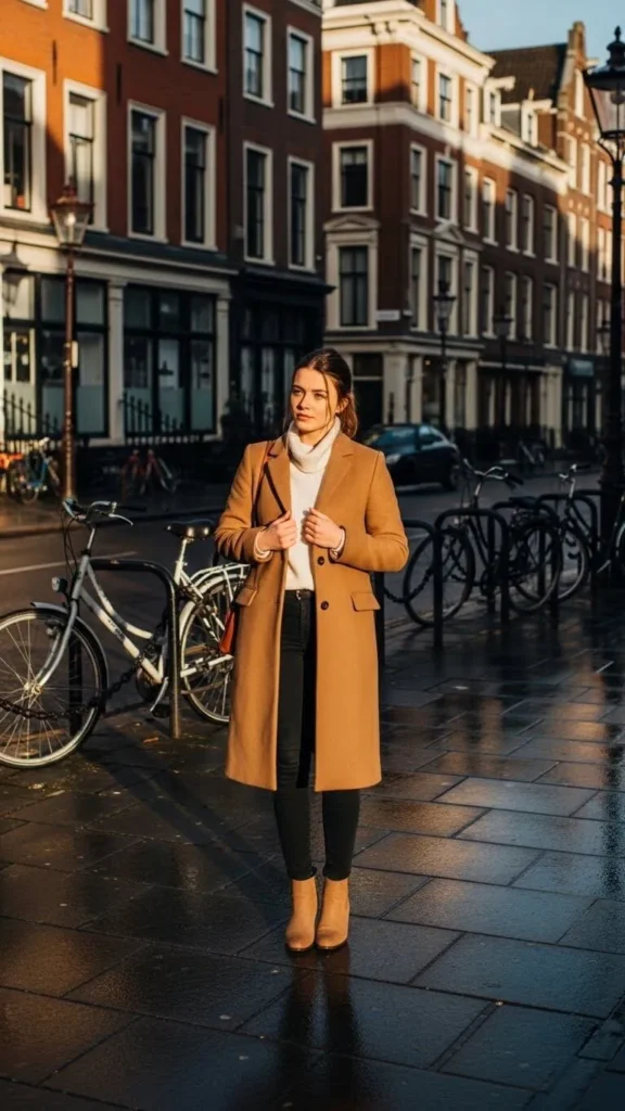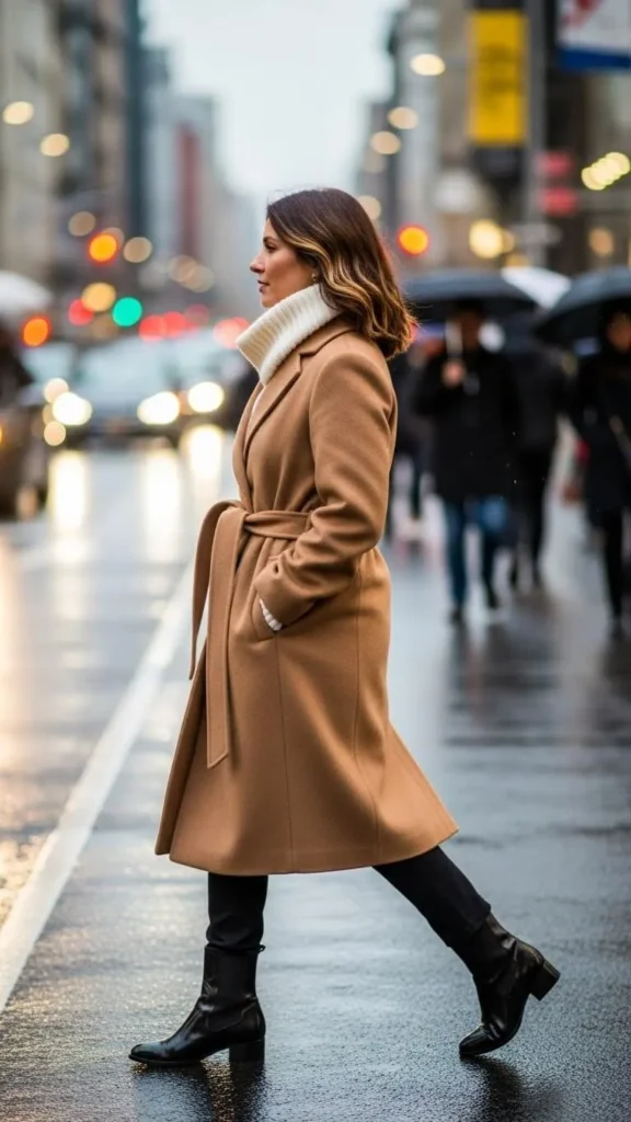 Start with a camel coat—it’s timeless and works for any occasion. Pair it with skinny jeans and your favorite boots. Add a white turtleneck for warmth without bulk. For an affordable trick, use jeans you already own and layer with a thrifted camel coat. This look looks polished, but is easy and wallet-friendly.