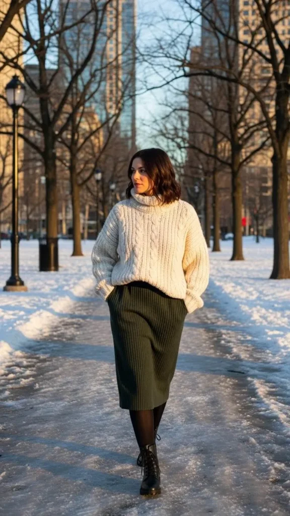 Chunky sweaters create the perfect contrast when paired with a flowy midi skirt. Choose a skirt in a warm fabric like ribbed knit for extra coziness. Black tights keep your legs warm on chilly days. This outfit is easy with pieces you can mix and match from your closet or budget stores.