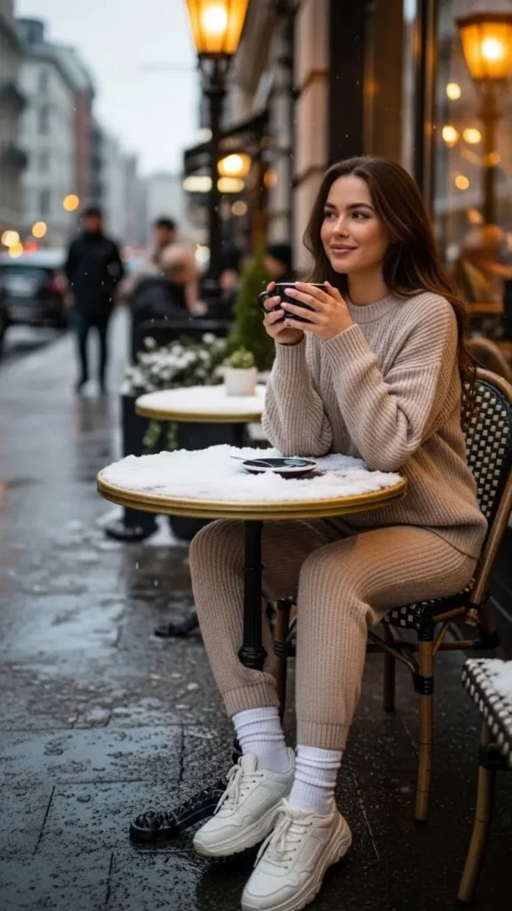 Double knits or matching sets are cozy and ultra-comfy. Wear them casually with sneakers for winter strolls or casual workdays. Many affordable brands offer matching knit sets that look put-together but cost less.