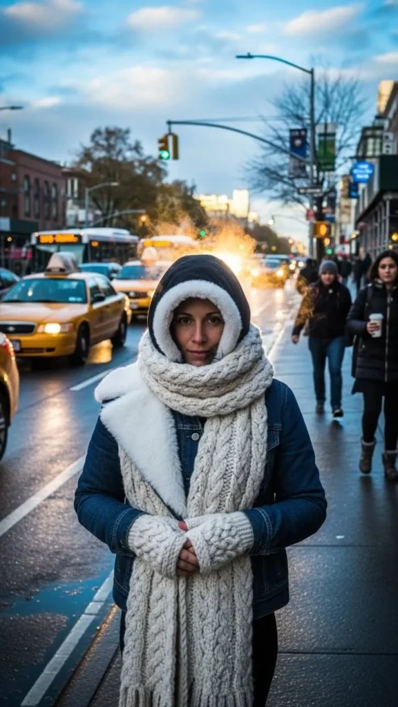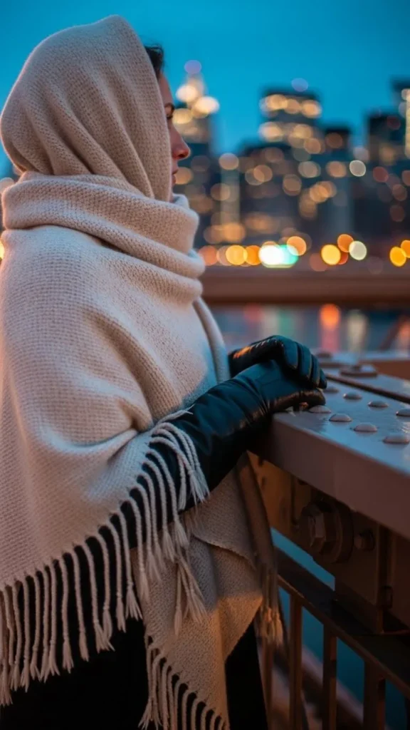 Use oversized shawl scarves as quick-wrap outer layers. Pair with simple leather gloves for warmth and sophistication on a budget. This combination works well over lighter coats or sweaters.