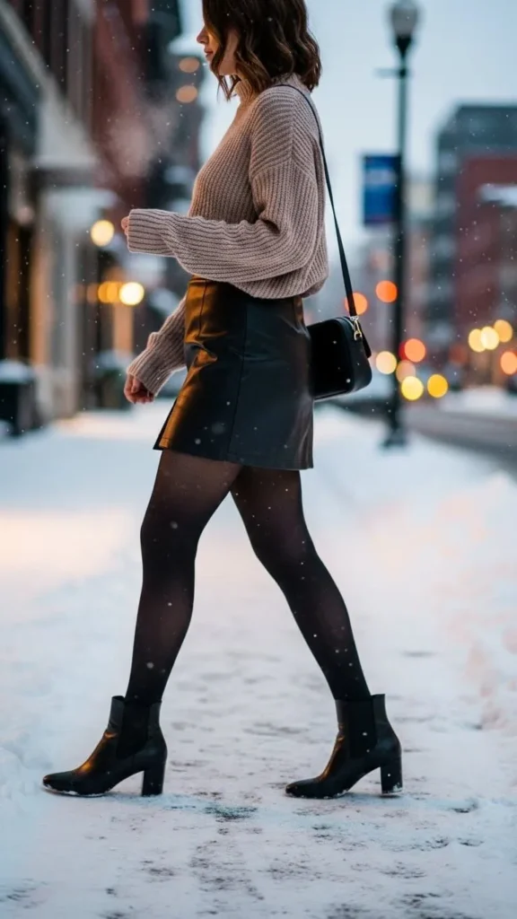 Try mixing textures like leather and knit to keep outfits interesting. Faux leather skirts are affordable and winter-appropriate. Add a comfy sweater and tights for a budget-friendly warm combo.