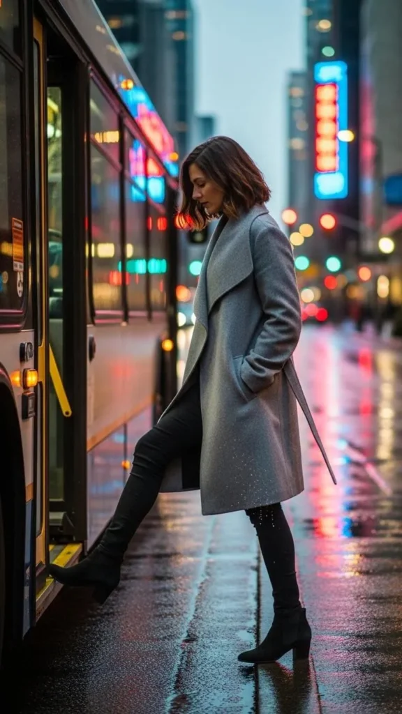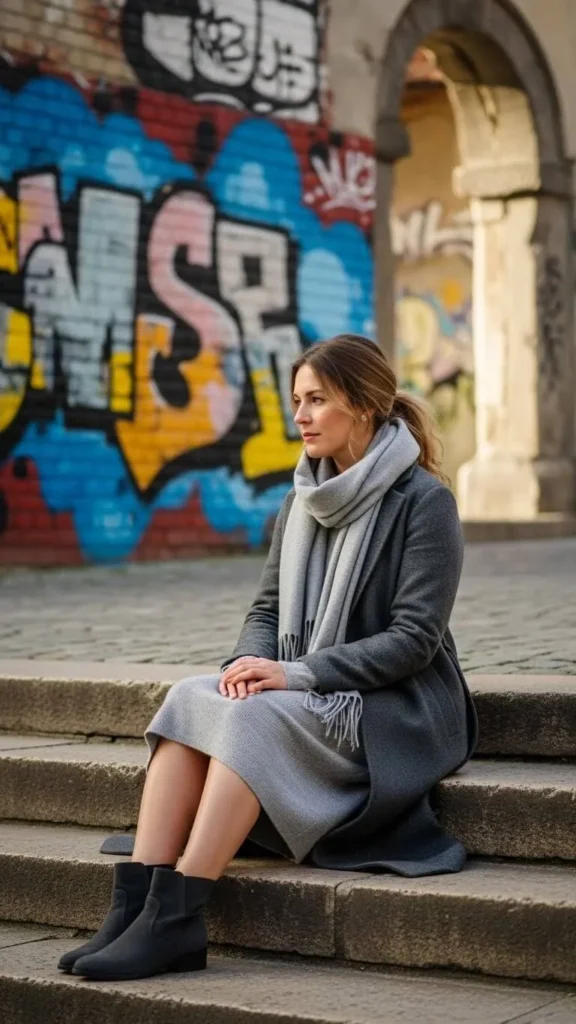 Wear layers in the same shade for a soft and elegant look. Grey is versatile and hides winter grime well. Mix affordable sweaters and coats you already own. Use scarves to add texture. This approach feels sophisticated without spending extra.