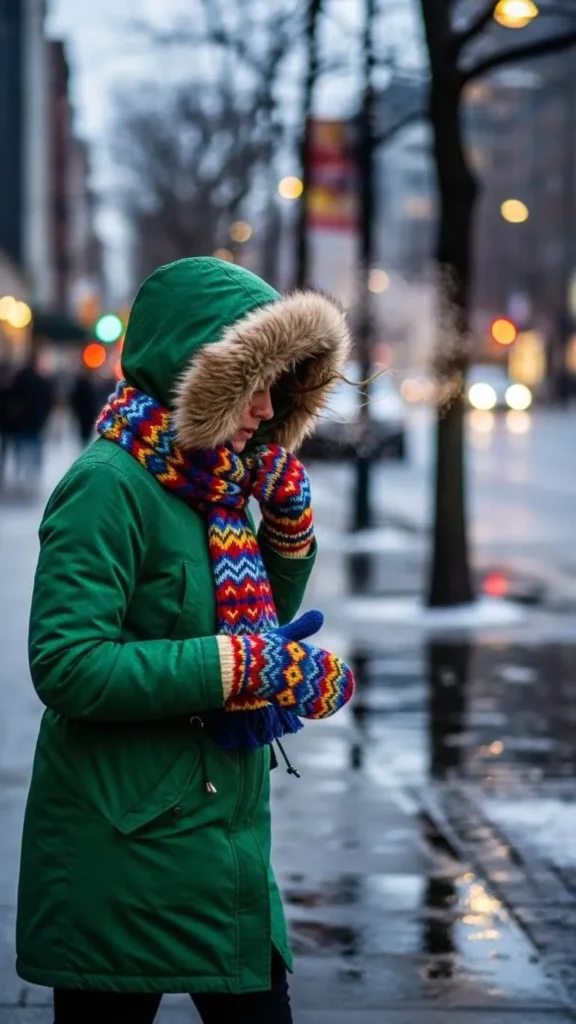 Parkas are practical and warm, perfect for city weather. Add patterned mittens or scarves to bring life to the outfit cheaply. Knit your own mittens or search thrift shops for bright accessories.