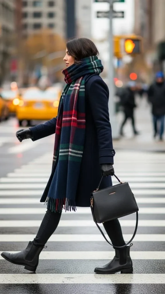 Plaid scarves are an easy way to add personality and color. They pair perfectly with a structured wool peacoat. Look for sales or secondhand options for scarves and coats. Keep gloves simple to balance the look and stay warm without fuss.
