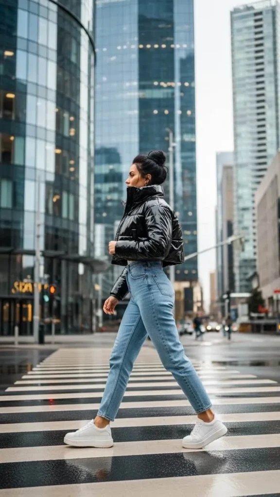 Puffer jackets keep you warm and on trend. A cropped puffer creates a fun silhouette. Pair it with high-waisted jeans for casual city walks. This look works great with thrifted puffers and denim found on sale. Sneakers finish the comfy vibe.