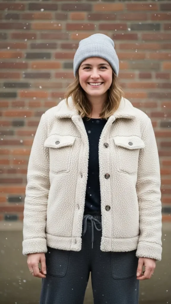 Sherpa jackets are soft, warm, and cozy. Pair with simple beanies to finish the look. Both items are easy to find at outlet stores or seasonal sales. This look is casual chill for weekends or errands.