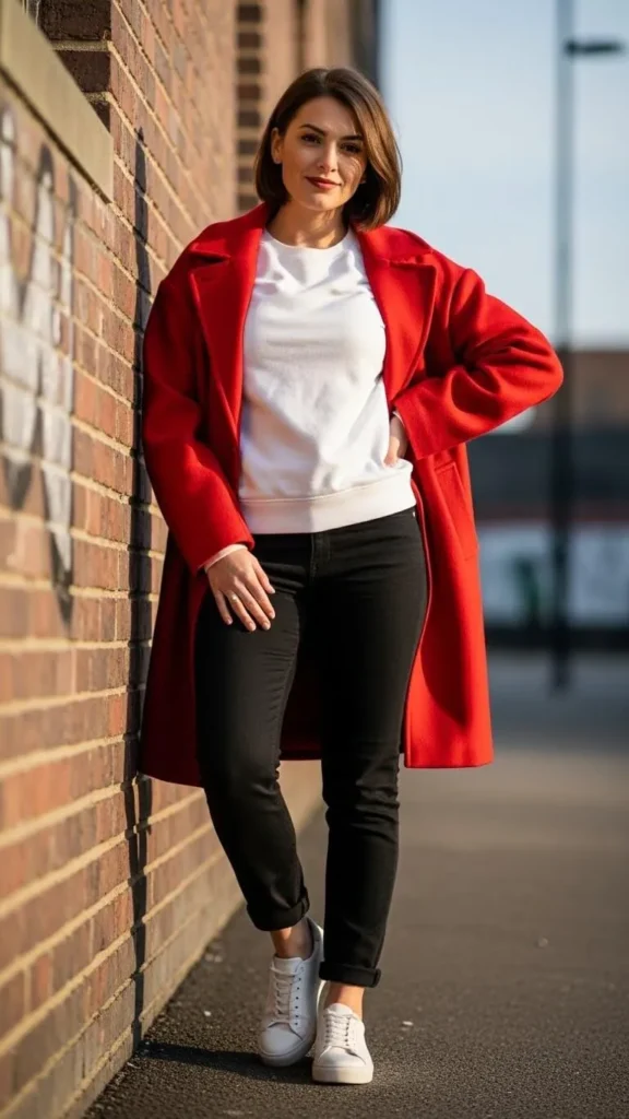 Statement coats are investment pieces but look dramatic over simple basics. Use black jeans and plain sweatshirts you may already own underneath. This keeps the focus on your standout outerwear without extra spending.