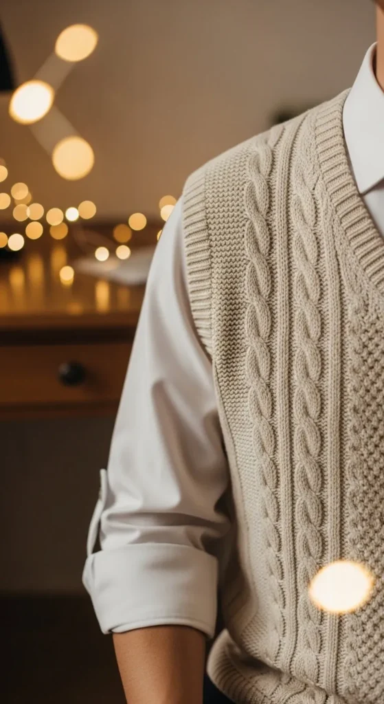 Layering a cable knit vest over a crisp shirt feels timeless. Add tights or jeans to finish it off. This look works for both home gatherings and office parties. You can repurpose old knits by cutting sleeves off a worn sweater.