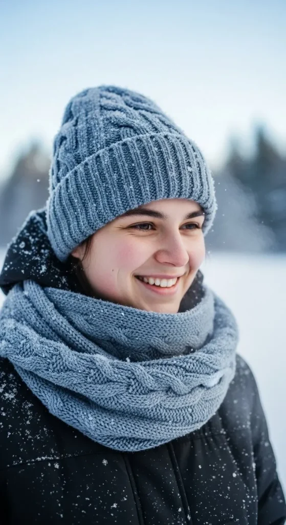 A matching beanie and scarf set ties everything together. Pick soft wool or acrylic yarn for warmth. You can knit your own using simple patterns online. Match colours with your coat or sweater for a coordinated winter vibe.