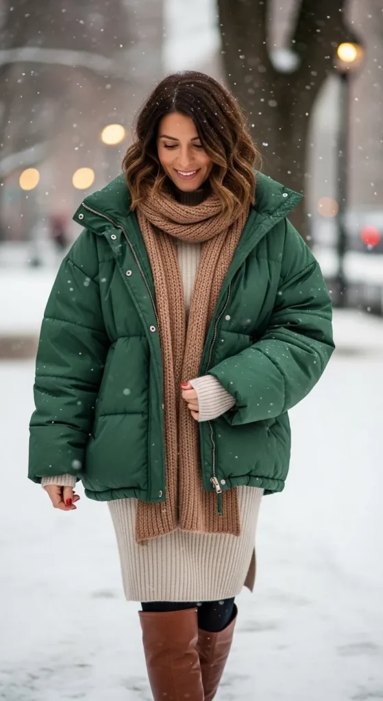 Layer a puffer jacket over a knit dress for warmth and shape. Add high socks and chunky sneakers for balance. It’s the perfect mix of sporty and feminine. Go for mid-length puffers for better layering flexibility.