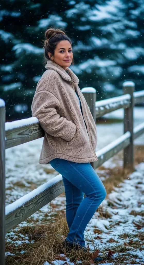 Stay toasty with a sherpa jacket over your jeans. It’s warm, fluffy, and perfect for layering. Add a knit beanie for charm. These jackets often go on sale during winter, so you can grab one without spending much. Great for outdoor strolls or market trips.