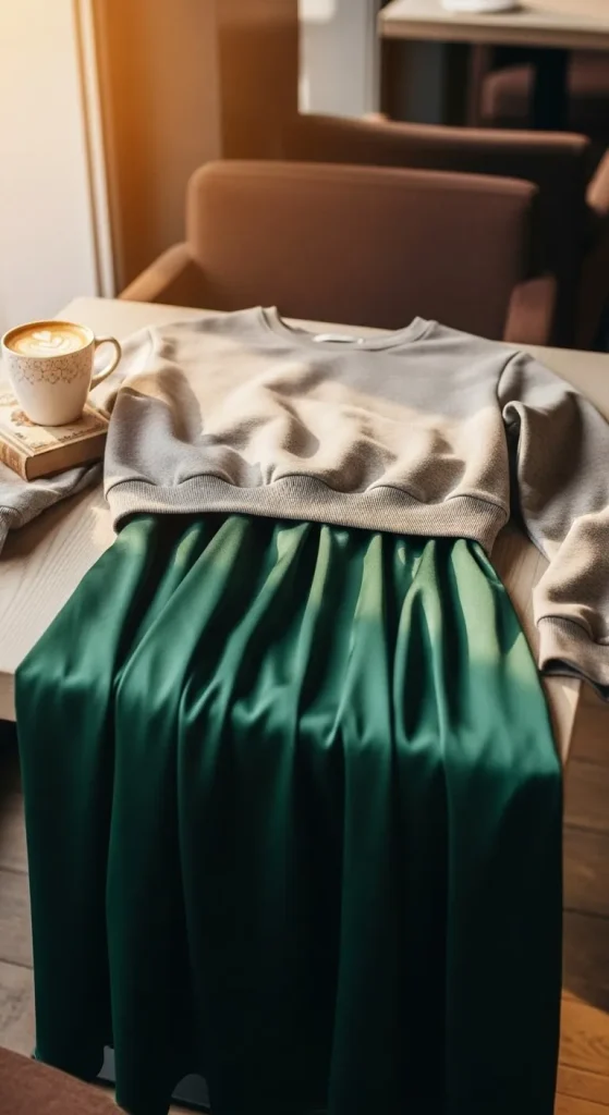 Mixing casual and fancy pieces always works. Try a sweatshirt with a satin skirt for an unexpected but comfy look. Add sneakers for balance. It’s perfect for coffee runs or cozy brunches. If you don’t have satin, use any flowy skirt and tuck the sweatshirt slightly at the front.