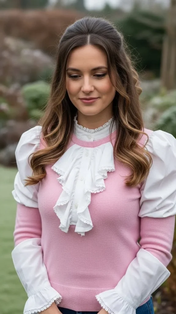 Add a feminine touch by layering a ruffled blouse under a crewneck sweater. The visible ruffles lift any sweater outfit and add cuteness. This layering trick is budget-savvy—grab an inexpensive blouse and sweater combo. Pair with jeans or a skirt for easy winterwear. DIY: use fabric glue to add lace or ribbon trims to a plain blouse.