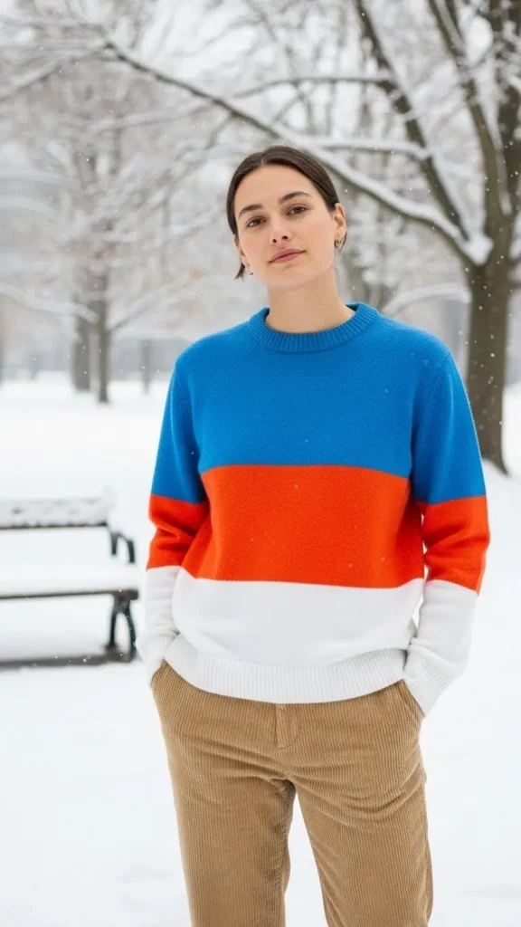Color-blocked sweaters can brighten dull winter days. Match them with soft corduroy pants for texture and warmth. Buying seasonal clearance finds can help you snag affordable pants and sweaters. Corduroy is forgiving and comfy for casual wear. Roll cuff hems and add colorful socks for a cute twist.