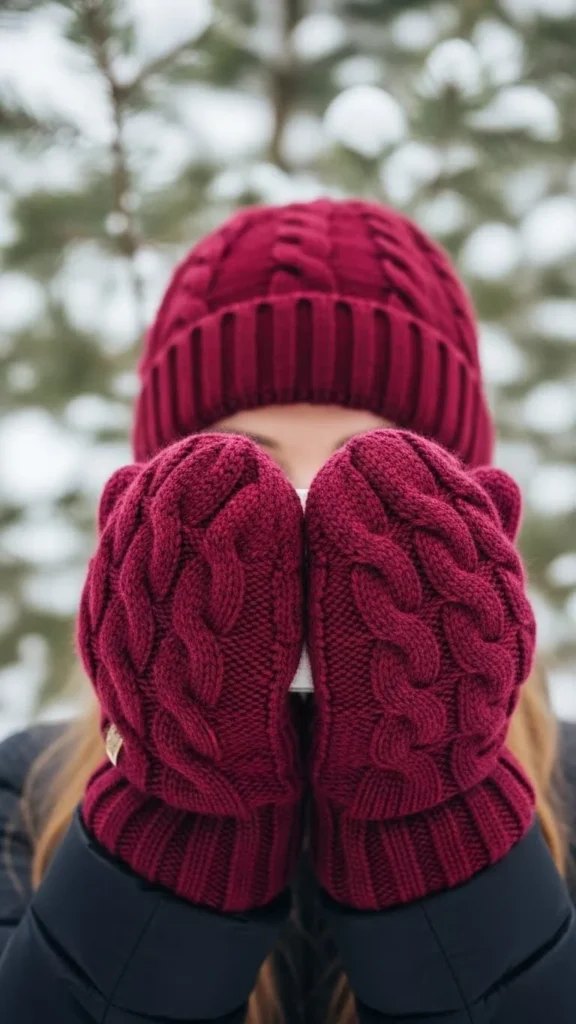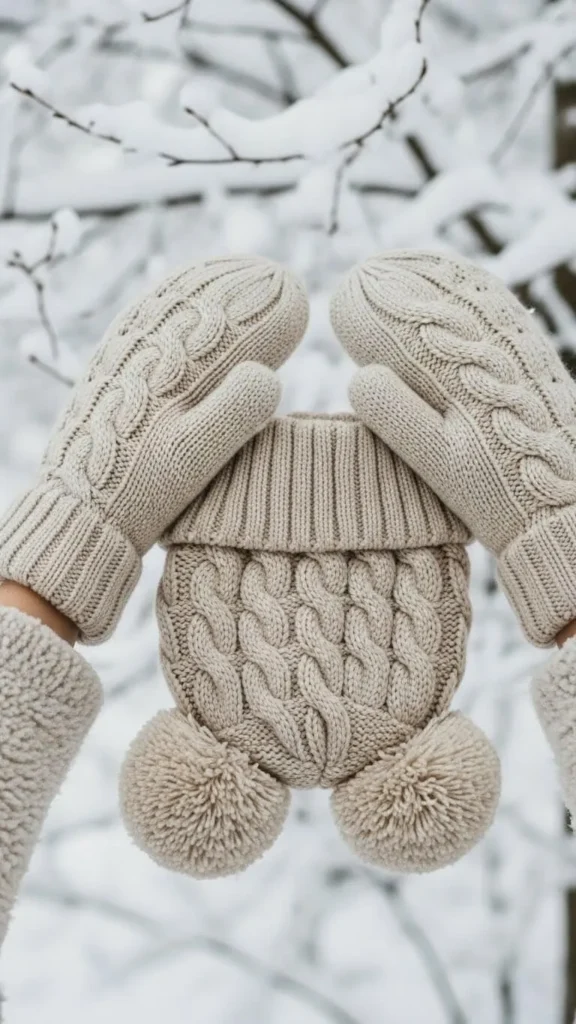 Hand-knit or store-bought cable knit mittens with a matching hat create sweet, coordinated winter accessories. Yarn stores usually sell affordable knitting supplies if you want to try DIY. Matching accessories instantly pull any outfit together and add warmth without effort.