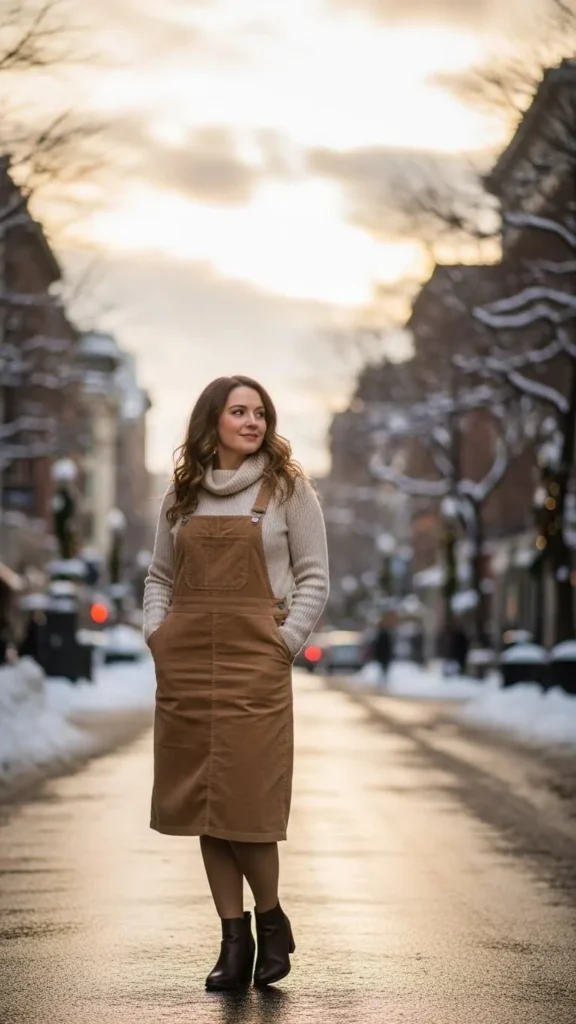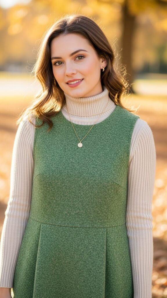 Layering a turtleneck under a pinafore dress creates a winter-ready outfit that’s both cute and practical. Use neutral tones for a cozy, timeless feel. This look works with boots or flats. Pinafores can be thrifted or sewn from simple patterns. Choose stretchy turtlenecks that you can wear alone too.
