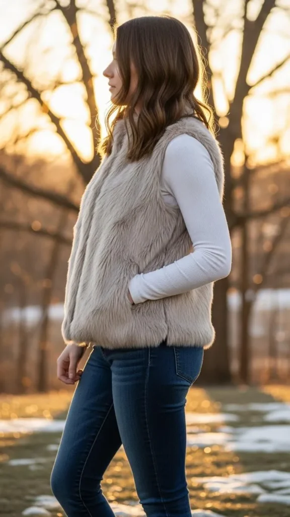 9. Faux Fur Vest Over Long-Sleeve Shirt