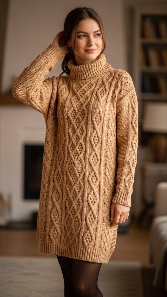 Sweater dresses are a winter game changer. A cable-knit dress keeps you warm and looks feminine. Pair it with black or patterned tights for a complete look. Accessorize with statement earrings or a simple leather belt to cinch at the waist. This combo works well for day or night outings. Search sales and thrift shops for knit dresses in classic neutral tones.